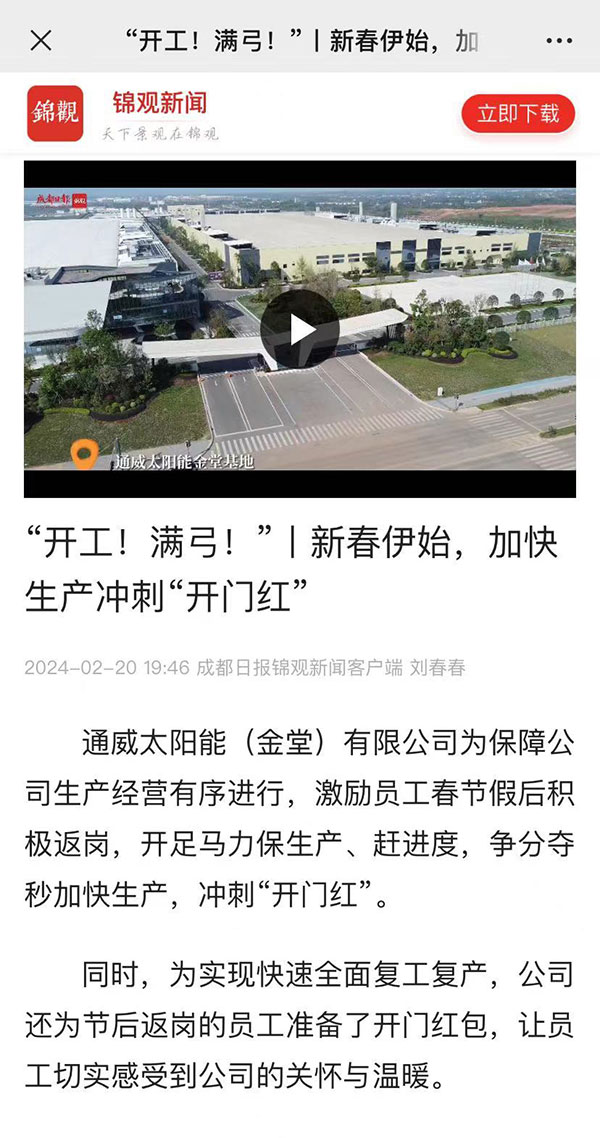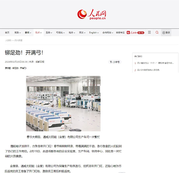 人民網(wǎng)、四川新聞網(wǎng)、成都日報(bào)等多家媒體聚焦通威太陽能春節(jié)節(jié)后復(fù)工復(fù)產(chǎn)場景