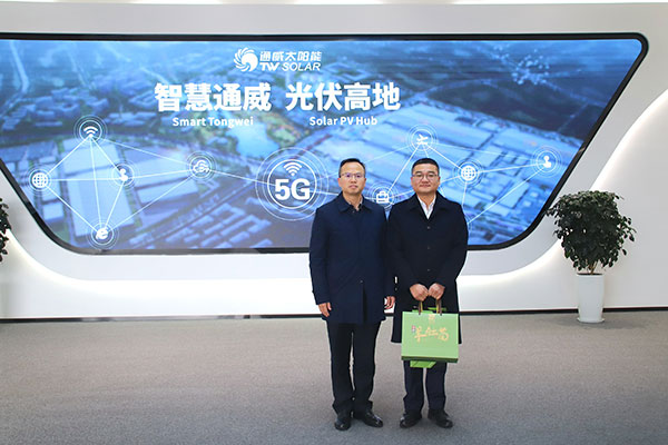 2月4日,金堂縣委副書記、淮州新城管委會主任羅勇一行蒞臨通威太陽能金堂基地慰問交流,金堂基地總經理助理龐三鳳熱情接待。