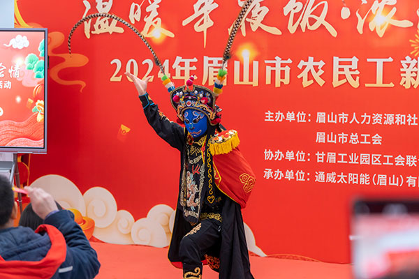 活動現場氣氛熱烈而溫馨,洋溢著歡樂祥和的節日氛圍。大家齊聚一堂,共同欣賞川劇變臉、歌唱表演、詩歌朗誦等精彩節目,品嘗豐盛的年夜飯。同時,市總工會、市人社領導還現場為農民工代表們發放了慰問品,向辛勤工作在崗位一線的農民工們致以最誠摯的祝福和最溫暖的關懷。