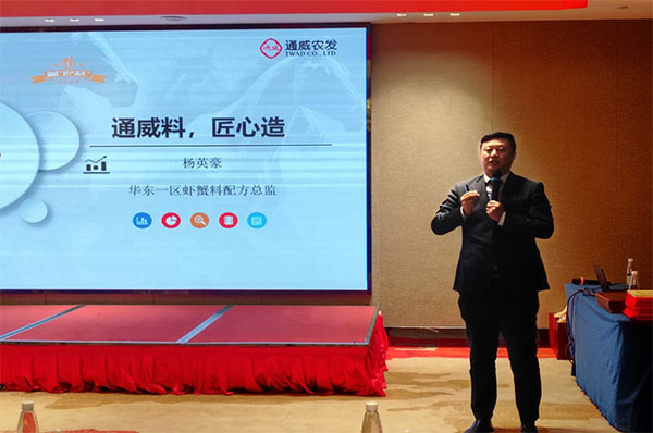 華東一區特水技術總監楊英豪通過數據展示好產品年的養殖成果,并以專業角度詳細介紹了“通天蟹”、“蟹豐寶”兩大主要產品,使得經銷商了解產品品質,堅定養殖信心,助力養殖效益最大化。
