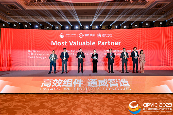 大會為長期以來支持、助力通威組件發展的合作伙伴頒獎,42家客戶分別獲得“同心共筑——通威組件供應商合作獎”“和衷共濟——通威組件合作伙伴價值獎”“通力合作——通威組件供應商品質獎”“征途與共——通威組件全球合作伙伴價值獎”殊榮。