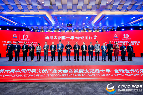 過去十年,通威太陽(yáng)能的成長(zhǎng)和發(fā)展,離不開光伏同行的鼎力相助和合作伙伴的大力支持。在成立之初,通威太陽(yáng)能就把與供應(yīng)商、客戶的合作共贏放在第一位。大會(huì)特別頒發(fā)砥礪同行獎(jiǎng)、通力合作獎(jiǎng)、同舟共濟(jì)獎(jiǎng)。