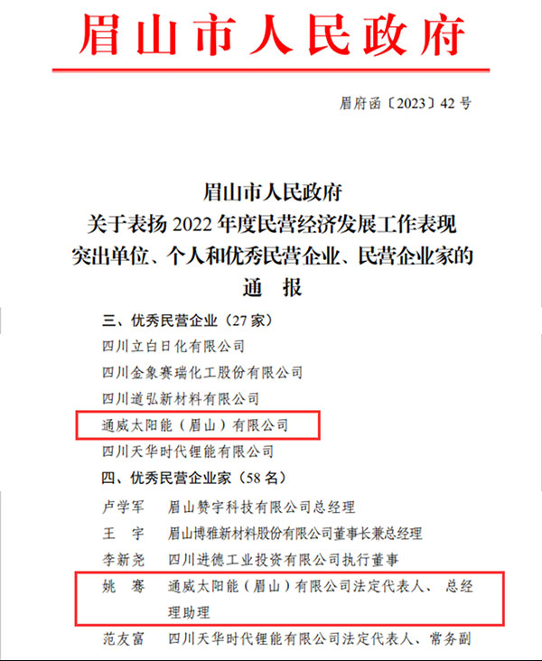 為鼓勵(lì)發(fā)展民營(yíng)企業(yè)、推動(dòng)全市經(jīng)濟(jì)高質(zhì)量發(fā)展,近日,眉山市人民政府發(fā)布《關(guān)于表?yè)P(yáng)2022年度民營(yíng)經(jīng)濟(jì)發(fā)展工作表現(xiàn)突出單位、個(gè)人和優(yōu)秀民營(yíng)企業(yè)、民營(yíng)企業(yè)家的通報(bào)》,通威太陽(yáng)能眉山基地榮獲眉山市“2022年度優(yōu)秀民營(yíng)企業(yè)”稱號(hào),眉山基地總經(jīng)理助理姚騫當(dāng)選眉山市“2022年度優(yōu)秀民營(yíng)企業(yè)家”。