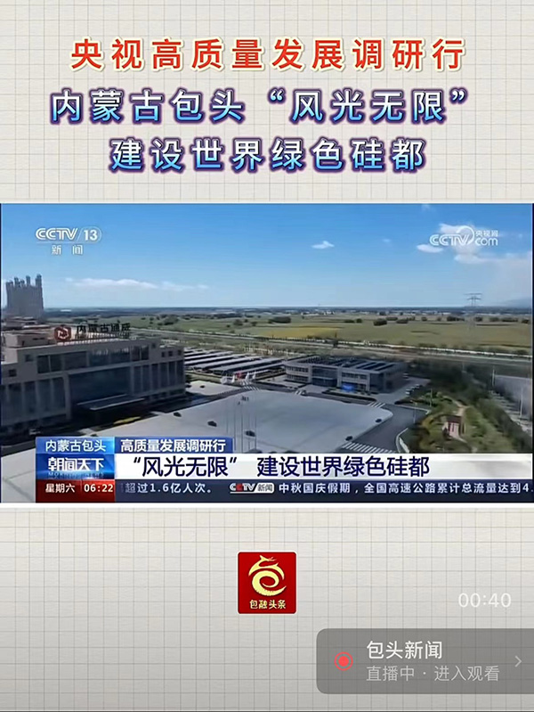 近日,央視新聞頻道推出《央視高質量發(fā)展調研行》 專題報道走進內蒙古包頭建設世界綠色“硅都”,報道包頭這座老工業(yè)城市把握機遇、加速破題,通過產(chǎn)業(yè)轉型升級推動城市發(fā)展實現(xiàn)新突破、開創(chuàng)新局面的成效和經(jīng)驗。內蒙古通威作為包頭這座老工業(yè)城市升級轉型的重要載體,充分發(fā)揮“領頭雁”和“排頭兵”的作用,對帶動下游產(chǎn)業(yè)發(fā)展發(fā)揮了積極作用,讓上下游企業(yè)的戰(zhàn)略聯(lián)盟和產(chǎn)業(yè)配合,推動產(chǎn)業(yè)更快的發(fā)展