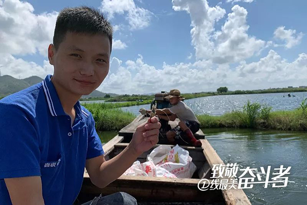 上午10點,氣溫升到36℃ ,一位養殖戶正要收蝦。“正好我來幫你收,順便看看吃了通威料的蝦長得怎么樣了。”說罷,朱俊杰熟練地戴上遮陽帽和手套,換上塑料拖鞋,挽起褲腿,騎著摩托車穿過崎嶇的塘間小路,跳上了收蝦的小船。“我們在拜訪養殖戶的同時,常常幫助他們做一些力所能及的事情,不僅是做客情,增進對養殖戶了解,同時也是不斷學習、不斷實踐的過程。”狹窄的小船蕩漾在波光粼粼的水面上,朱俊杰配合養殖戶從塘里收起了一籠一籠的蝦。