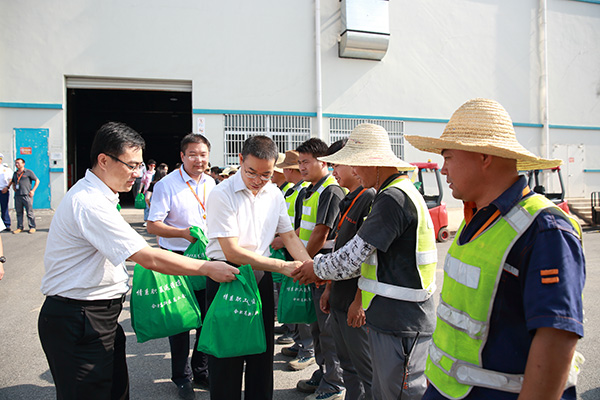 慰問活動中,宋道軍主任與每一位戶外工作員工親切交談并握手,親自將慰問品送到他們手中,了解戶外工作員工的身體情況和工作情況,并致以深深的敬意,感謝他們?yōu)楣靖冻龅男燎诤顾瑸樯鐣淼膴^斗精神。“高溫天氣工作確實(shí)挺辛苦的,但有領(lǐng)導(dǎo)們的關(guān)懷和慰問,再難再艱辛我們也一定能克服”,計(jì)劃部一位叉車作業(yè)員感激地說道。