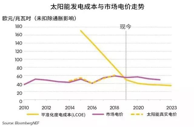 圖中黃色實(shí)線為LCOE(平準(zhǔn)化度電成本,Levelized Cost of Energy),是國際上通用的評價度電成本的指標(biāo)。紅色實(shí)線為市場電力價格。