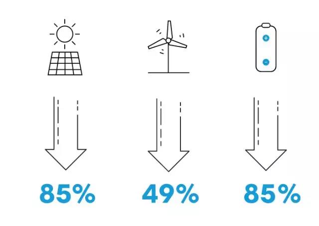 2010年以來,太陽能、風(fēng)能和電池的成本下降比例