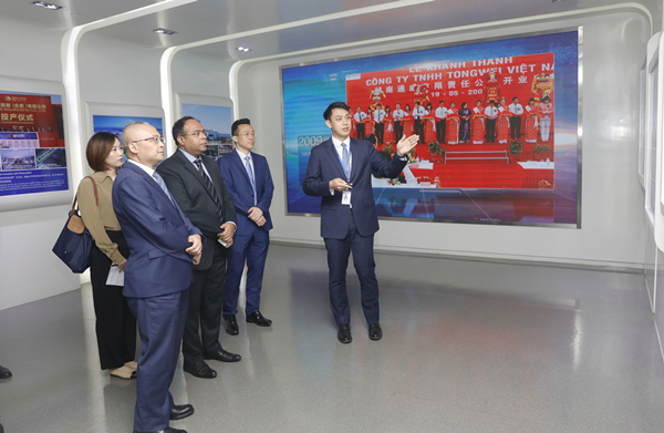 高士總領事一行先后參觀了通威太陽能智能制造生產車間、集團體驗中心,詳細了解了通威37年穩健發展歷程以及農業與新能源雙主業協同發展現狀,對通威太陽能現場管理、技術研發、設備先進性給予高度贊賞。