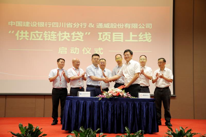 6月11日,中國建設(shè)銀行四川省分行與通威股份有限公司“供應(yīng)鏈快貸”項目上線啟動儀式在通威國際中心隆重舉行。中國建設(shè)銀行四川省分行副行長黃永航、住房金融業(yè)務(wù)部總經(jīng)理余偉,通威股份郭異忠總裁、財務(wù)總監(jiān)周斌等出席啟動儀式。建設(shè)銀行四川省分行、通威農(nóng)業(yè)融資擔保有限公司、通威股份財務(wù)部等相關(guān)部門負責人共同見證項目啟動。