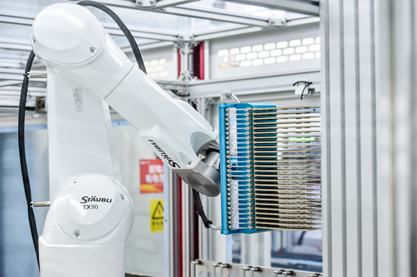 在通威太陽能成都公司A1生產車間里,你很少見到工作人員參與其中,取而代之的是智能機器人、智能器械臂忙碌的身影。這樣的智能機器人運行時長達12小時,生產效率提升141%,不良率降低12.5%,碎片率降低25%。通過智能化生產,通威高效電池片產線能耗降低到原來的三分之一甚至更低。今年開工的成都4期3.8GW和眉山10GW高效晶硅電池項目,產線繼續以無人化生產為主,建設智能化工廠、數字化車間。與傳統人工產線相比,人工數量、生產成本大幅下降,勞動效率、經濟價值方面大幅提高。