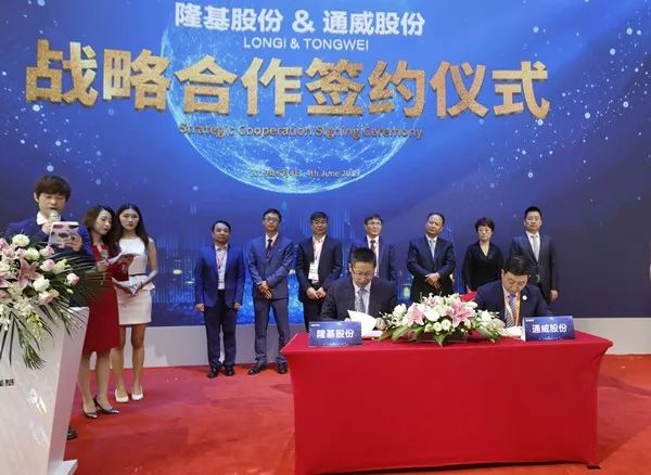 6月4日上午,通威股份與隆基股份戰略合作簽約儀式在隆基展臺成功舉行,十一屆全國政協常委、全國人大代表、通威集團董事局劉漢元主席,隆基股份董事長鐘寶申,全國工商聯新能源商會常務副秘書長史利民,通威集團禚玉嬌總裁,通威股份謝毅董事長,通威股份光伏事業部總裁陳星宇,通威集團副總裁胡榮柱,隆基股份組件事業部高級副總裁陳紅、硅片事業部營銷部副總裁謝天等領導出席簽約儀式,見證了雙方達成戰略合作,隆基股份投資管理部總監周義成、永祥股份董事長兼總經理段雍代表雙方簽約。