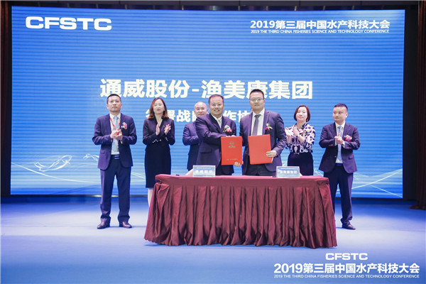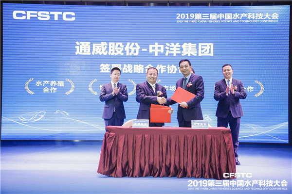 16時50分,在劉漢元主席、謝毅董事、錢曉明董事長等領導的見證下,通威股份郭異忠總裁分別與湖南漁美康生物技術集團有限公司總裁劉紹春、江蘇中洋集團股份有限公司常務副總裁朱永祥代表的兩家企業簽署了《通威-漁美康簽署戰略合作協議》、《通威-中洋簽署戰略合作協議》,攜手共促我國水產科技創新,推動行業邁入高質量發展軌道!