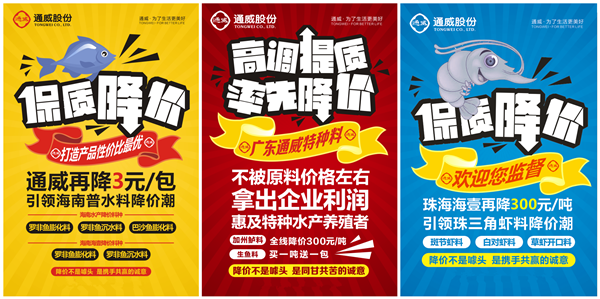 目前普水料四度主動(dòng)降價(jià),已為終端養(yǎng)殖戶節(jié)省約0.4元/斤的斤魚(yú)養(yǎng)殖成本;同時(shí),所有普水料產(chǎn)品工藝提升,80%產(chǎn)品的蛋白、賴氨酸等指標(biāo)提升;由于特種水產(chǎn)原料成本居高不下,在3月初首次降價(jià)后所有廠家均按兵不動(dòng)的情況下,通威率先喊出泥鰍料降價(jià)300元/噸,成為市場(chǎng)降價(jià)幅度最大的產(chǎn)品;隨后,在珠江三角洲地區(qū)擁有蝦料絕對(duì)產(chǎn)品力口碑優(yōu)勢(shì)的通威當(dāng)仁不讓,珠海海壹宣布3款蝦料降價(jià),再次引發(fā)行業(yè)強(qiáng)烈關(guān)注!