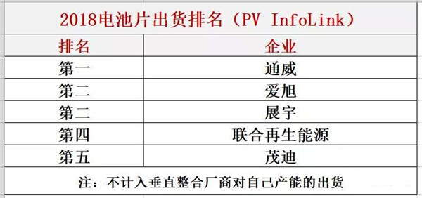 歲末年初,根據PV InfoLink數據庫最新統計,2018年電池片出貨第一之廠家依然是通威,愛旭與展宇并列第二,而聯合再生能源、茂迪則位列四、五名。從產業鏈全局來分析,2018年可說是電池片勢力的重要轉折點,通威等電池片大廠挾規模化以及新產能的成本優勢,紛紛沖出了超過4GW的出貨,尤其通威總出貨量超過6.5GW,遙遙領先其他電池廠。PV InfoLink預期此三家電池廠在2019年也將穩居電池片出貨前三名之列。