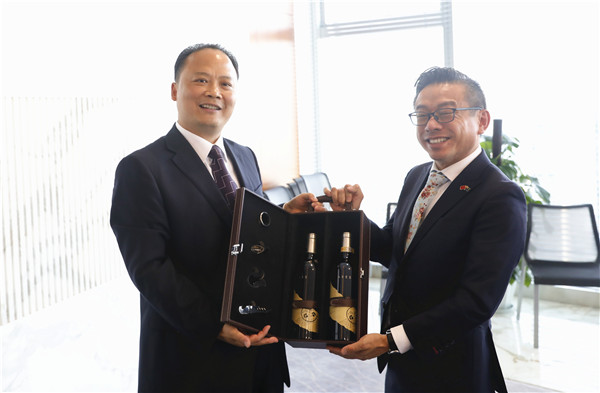 林明皓總領(lǐng)事向劉漢元主席贈送禮物