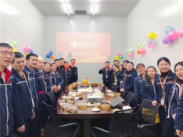 為豐富員工業(yè)余文化生活,增強(qiáng)員工歸屬感與團(tuán)隊凝聚力。2019年,通威大學(xué)光伏學(xué)院在往年季度生日會的基礎(chǔ)上增加了以“高管走進(jìn)車間送祝福”為主題的月度生日活動。近期,光伏學(xué)院2019年月度員工生日會如期舉行,兩地高管團(tuán)隊及相關(guān)部門負(fù)責(zé)人分別來到生日會現(xiàn)場為1月、2月生日壽星送祝福。
