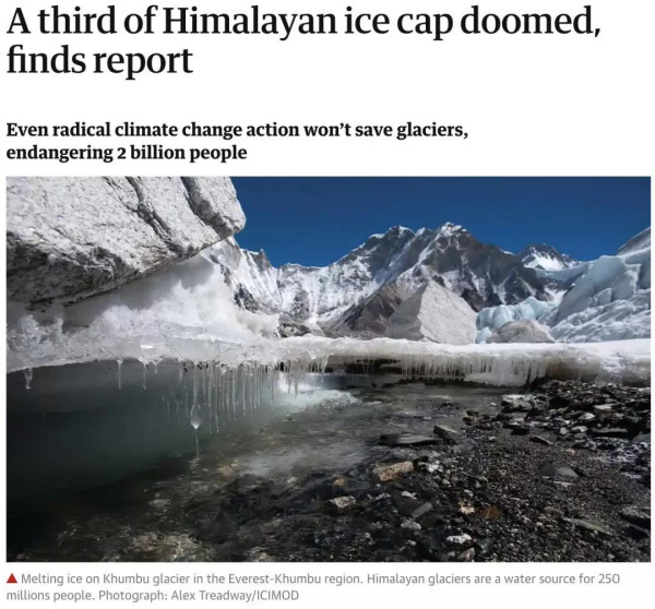 該報告的負責人菲利普·韋斯特說:“在不到一個世紀的時間里,全球變暖將會讓興都庫什-喜馬拉雅地區那些被冰川覆蓋的寒冷山峰變成裸露的巖石。”