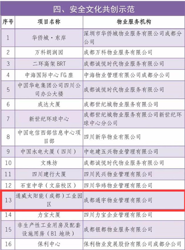 1月16日,成都市物業管理協會對外發布《關于設立成都市物業服務標準化示范項目的決定》。其中,由通宇物業提供物業服務的通威國際中心和通威太陽能(成都)工業園區項目分別榮獲“黨建共治示范項目”和“安全文化共創示范項目”榮譽稱號。