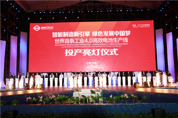 2017年9月20日,通威太陽能世界首條工業4.0高效電池生產線投產亮燈儀式隆重舉行。通威集團董事局劉漢元主席與35位重磅嘉賓共同啟動亮燈儀式,標志著通威“智能制造新引擎 綠色發展中國夢”征程的全新啟航。