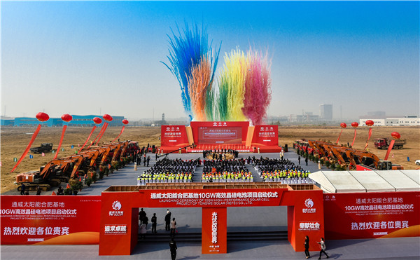 2017年11月8日,通威太陽能合肥基地10GW高效晶硅電池項目啟動儀式隆重舉行。該項目的開工建設將進一步突顯通威太陽能在高效晶硅電池領域的規模優勢、成本優勢及質量優勢,強化提升市場競爭力,助力公司打造世界級光伏企業和世界級清潔能源公司。