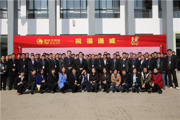 2014年11月18日,通威太陽能(合肥)有限公司舉行投產周年慶活動,工廠近400名員工代表參加了本次活動。通威集團董事局劉漢元主席發來賀信,對公司投產周年慶表示祝賀并提出殷切希望,鼓勵大家持之以恒地發展太陽能光伏新能源事業,為把通威太陽能建設成為世界一流的清潔能源企業而努力奮斗!