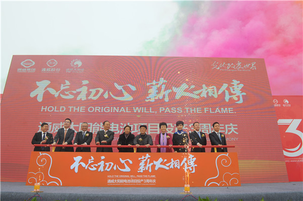 2016年11月18日,通威太陽能電池項目投產三周年慶隆重舉行。三年來,通威太陽能公司不斷提高精細化、現代化、規模化、標準化管理,各項生產指標領先行業,已實現全球電池片環節生產成本最低、電池品質客戶端評價最優、電池出貨量全國最大、開工率全行業最高、電池產能規模全球第一。