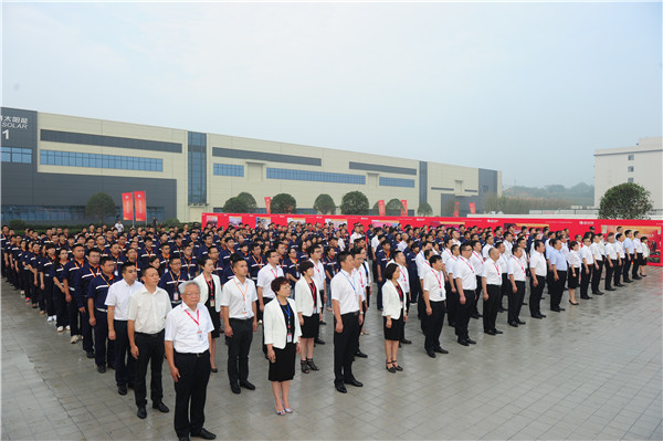 2016年8月8日上午8點8分,通威太陽能(成都)有限公司項目竣工首次升旗儀式隆重舉行。升旗儀式后,通威集團董事局劉漢元主席發表重要講話指出,隨著雙流5GW高效晶硅電池項目一期的竣工,通威太陽能(成都)有限公司的發展開啟了全新篇章,必將以最快的速度、最高的效率,昂首闊步在神州大地。