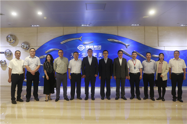 凌根華、周濤總經理一行首先參觀了通威集團體驗中心,詳細了解了通威36年發展歷程,對于通威農牧和新能源雙主業協同發展成果表示高度贊賞。