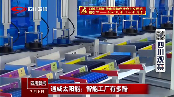 7月9日,四川衛視《四川新聞》推出 “新時代、新作為、新篇章”專題報道,記者走進位于成都雙流的通威太陽能(成都)有限公司,將鏡頭對準通威太陽能世界首條工業 4.0 高效電池生產線,以《通威太陽能:智能工廠有多酷》為題,聚焦通威太陽能以智能制造推動綠色低碳發展的成果。