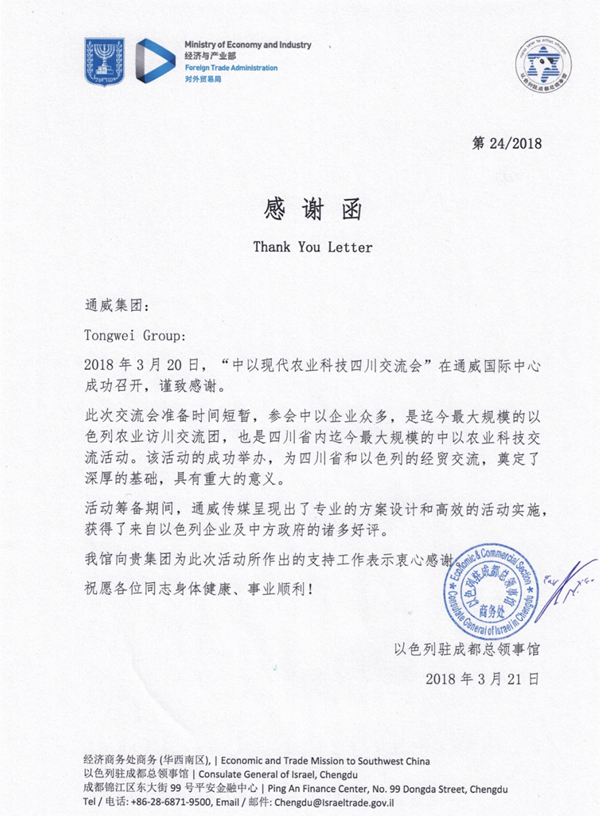 以色列駐成都總領事館專程向通威集團發來感謝函