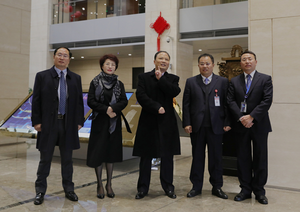 劉漢元主席等總部領導在大廳迎接新年后第一天上班的員工