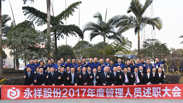 最后,段雍董事長作重要指示:一、工作述職令人熱血沸騰。今年是第四次參加干部述職大會,一路聽下來,大家PPT呈現的內容越來越豐富越來越精彩,PPT的質量也越做越高,從這簡單的細節變化便可以看出干部狀態的變化、素質的變化。二、回過頭看2017年初對全年的工作謀劃,永祥人都做到了。永祥提出的綠色環保年,通過媒體聚勢聚焦,得到了宣傳。并且在大氣治理方面永祥也走出重要的一步,受到各界人士點贊;在“效能提升”上,各公司不僅在利潤上實現了突破,還實現了零安全環保事故;在“價值營銷”上,晶硅的銷售引領行業。水泥做精品,做出了品牌。樹脂營銷團隊對市場行情把握精準,實現了價值最大化;在“創新驅動”上,永祥靠著技術創新確保裝置的可靠性、穩定性和指標的領先性;在“文化引領”上,員工的精氣神起來了,員工的心熱起來了。圍繞十六字方針,每個人都在崗位上用實際行動踐行,無數個“白+黑”“5+2”踐行,最終取得了很好的成效。三、信念篤定,未來可期。2017年來之不易的成績只代表過去,2018年要繼續深化十六字方針,堅持“經營+基建”雙輪驅動,實現“安全環保+工藝技術”雙輪驅動,“阿米巴+班組建設”雙輪驅動,“專業技能+工匠精神”雙輪驅動,并扎扎實實抓好班組建設這一核心工作。