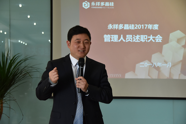 1月11日,永祥多晶硅2017年中層干部年終述職大會成功召開。通威股份董事、永祥股份董事長兼總經理段雍,永祥股份財務總監周斌,永祥多晶硅執行總經理袁中華,永祥股份副總經理兼永祥多晶硅副總經理禚東舉,永祥股份安全環??偙O羅海釗,永祥多晶硅副總經理汪云清出席會議。
