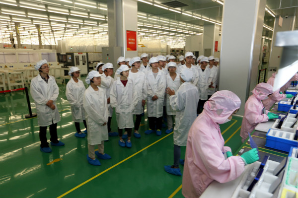 在S1電池車間,同學(xué)們詳細(xì)了解了成都基地太陽能電池片的生產(chǎn)流程和生產(chǎn)工藝。參觀結(jié)束后,通威“誠信正一”的經(jīng)營理念,生產(chǎn)車間高度自動化的電池片產(chǎn)線、先進(jìn)的科技設(shè)備以及嚴(yán)格規(guī)范的現(xiàn)場管理均給同學(xué)們留下了深刻印象。