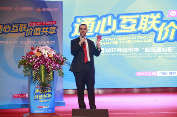 在通心粉社區兩周年生日慶典。作為一名外國“通心粉”,歐陽一出場就用燦爛的笑容和流利的中文征服了全場觀眾,他說,作為一名在四川養魚的“老外”,他很興奮能加入通心粉的大家庭,很榮幸能與劉主席見面。在社區兩周年生日party 這一特殊的場合,他祝福通心粉社區生日快樂,通威越來越好,成都越來越好,中國越來越好!