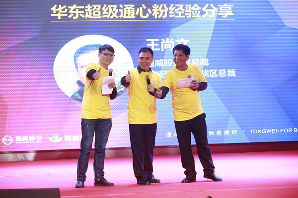 慶典上,通威股份副總裁兼華東戰(zhàn)區(qū)總裁王尚文與2016華東“超級通心粉”翁漢良、楊智超一同上臺,與大家分享2016年華東“超級通心粉”赴歐洲水產(chǎn)科技先進(jìn)國家學(xué)習(xí)、訪問心得。隨后,通威股份副總裁兼華中一區(qū)總裁沈金竹、通威股份華中二區(qū)總裁幸鵬從劉漢元主席手中正式接過了“超級通心粉”活動旗幟。沈總表示,2017尋找華中“超級通心粉”活動將進(jìn)一步助力華中戰(zhàn)區(qū)的市場營銷,通過深度聯(lián)動戰(zhàn)區(qū)客戶、粉絲,打通線上線下服務(wù)和推廣渠道,借勢拓展新客戶,全面助推華中一區(qū)2017年各項(xiàng)任務(wù)指標(biāo)的順利完成。幸總表示,本次活動給了華中二區(qū)借助網(wǎng)絡(luò)和社交來創(chuàng)新營銷及服務(wù)的好機(jī)會,華中二區(qū)將把活動與拿水面、料檔結(jié)構(gòu)調(diào)整等全年重點(diǎn)工作緊密結(jié)合,把活動辦得出彩、辦出實(shí)效、辦出成績,助力華中二區(qū)創(chuàng)造新價(jià)值、鑄就新輝煌!