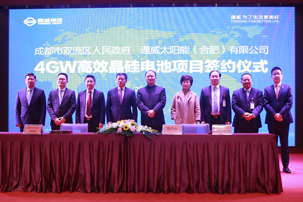 最后,在周先毅書記、劉漢元主席等領(lǐng)導(dǎo)的共同見證下,雙流區(qū)委副書記、區(qū)長(zhǎng)徐剛與通威太陽能(合肥、成都)有限公司董事長(zhǎng)謝毅進(jìn)行了通威太陽能4GW高效晶硅電池項(xiàng)目簽約。