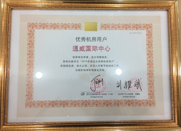 通威國(guó)際中心獲“2015年度遠(yuǎn)大優(yōu)秀機(jī)房用戶(hù)”證書(shū)
