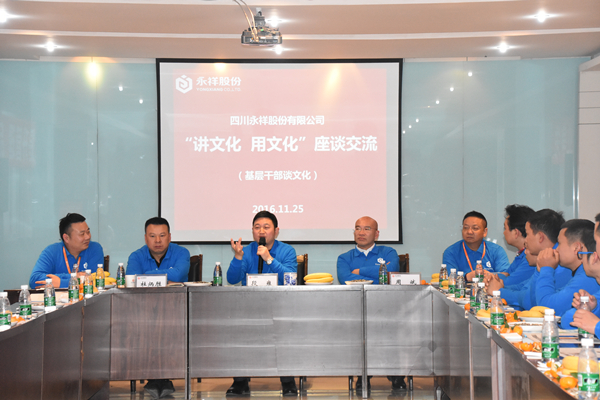 隨后的座談會由永祥股份主編、戰區文化專員龍小龍主持。今年作為永祥股份企業文化年,公司積極響應集團總部“文化引領管理”的戰略號召,以“融合、變革、創新”為主旨,以永祥十六字經營管理思路為指導,以講用活動、辯論賽、演講賽、攝影賽、歌詠賽、征文賽、籃球賽以及各種形式的團隊活動為重要形式,緊密結合降本增效、標準管理升級、管理提升JCC、項目攻關等具體工作,促進企業文化落地。