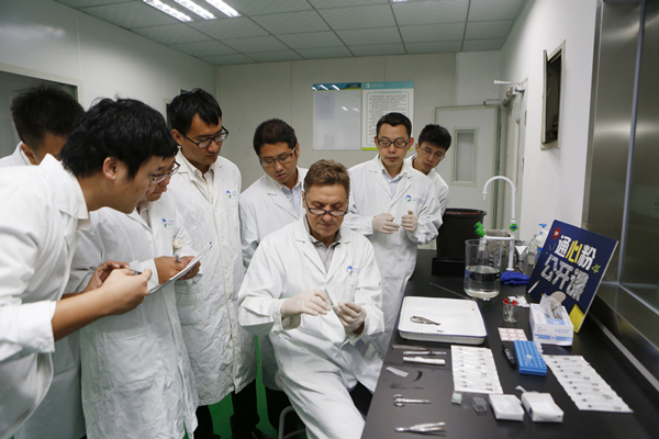 交流期間,布克曼教授就“魚類小瓜蟲病綜合防治技術(shù)研發(fā)和應(yīng)用”、“全球水產(chǎn)品生產(chǎn)帶來的疾病挑戰(zhàn)”等問題與動(dòng)保所技術(shù)人員進(jìn)行了深入研討,并參觀了依托通威股份建立的國家級工程實(shí)驗(yàn)室————水產(chǎn)養(yǎng)殖動(dòng)物疾病防控國家地方聯(lián)合工程實(shí)驗(yàn)室。布克曼教授對實(shí)驗(yàn)室的建設(shè)情況及研究成果給予了高度肯定,并表示希望通威能與哥本哈根大學(xué)強(qiáng)強(qiáng)聯(lián)手,一起攻克疑難魚病。