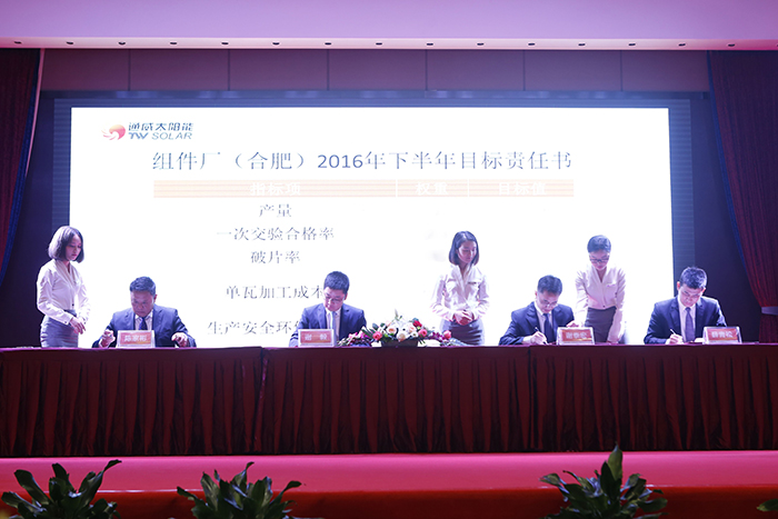 會(huì)議上,通威太陽能(合肥、成都)有限公司首席財(cái)務(wù)官周丹、高級(jí)副總裁張忠文、高級(jí)副總裁路廣軍首先從各自分管的部門工作出發(fā),結(jié)合市場競爭現(xiàn)狀,總結(jié)了上半年取得的成績,強(qiáng)調(diào)了下半年努力的方向和期望達(dá)成的目標(biāo)。通威太陽能(合肥、成都)有限公司首席運(yùn)營官謝泰宏、高級(jí)副總裁陳家彬、高級(jí)副總裁張冠綸、采購部部長薛青松分別就產(chǎn)供銷和研發(fā)體系進(jìn)行了總結(jié)計(jì)劃述職。隨后,產(chǎn)供銷三個(gè)系統(tǒng)分別與謝董事長簽訂了下半年年度目標(biāo)責(zé)任書。