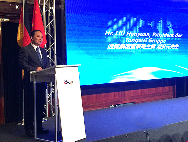 十一屆全國政協常委、通威集團董事局劉漢元主席作為川商企業代表,在致辭中指出,德國是一個高度發達的國家,經濟總量居全球第四,并長期位居歐洲首位,是名副其實的當今歐洲乃至世界的一流經濟強國。尤其是歐債危機期間,德國被公認為是帶領歐洲走出困境的核心力量。縱觀全球發展歷史,在近五十年的世界經濟發展歷程中,德國一直是全球經濟的主要推動力量之一,并在汽車和機械制造、化工、電氣、新能源等行業處于世界先進水平,德意志民族的嚴謹認真、對細節把控近乎苛刻的工匠精神,一直受到世界各國人民的高度推崇!特別是近十年來,德國以高度前瞻性的發展眼光,引領了世界光伏產業的迅猛發展。可以說,光伏產業能取得今天的豐碩成果,德國功不可沒!尤其在2004年,德國開全球之先,先后頒布了針對光伏發電的《上網電價法》及一系列優惠貸款、資金補貼政策,由此催生了新一輪以光伏發電為代表的清潔能源發展的高潮。2012年5月26日,是一個注定會被載入史冊的日子。當天,德國全國光伏發電站峰值功率達到22GW,相當于當時德國正午用電負荷的50%,即光伏發電在當天中午提供了德國一半的電力,創造了人類光伏發展史上一個里程碑!劉主席強調,中德兩國在全球經濟中都占有十分重要的地位。同時,中德兩國在經濟等各個領域也存在高度的互補性。德國的科研、裝備制造水平領先全球,在很多國際標準的打造和建立上影響力巨大,而中國是全球最大的市場,近年來正全面加速經濟發展模式的轉型升級,兩國具有巨大的市場和技術合作空間。