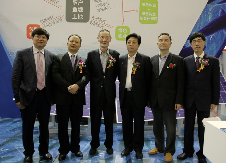 開幕式結(jié)束后,高鴻賓會(huì)長(zhǎng)等一行領(lǐng)導(dǎo)在劉主席的陪同下到通威展臺(tái)參觀,劉主席向高會(huì)長(zhǎng)詳細(xì)地介紹了通威“漁光一體”創(chuàng)新模式。通威“漁光一體”項(xiàng)目以光伏發(fā)電站為主,漁業(yè)養(yǎng)殖為輔,結(jié)合通威365健康養(yǎng)殖模式,拓展了通威太陽能光伏技術(shù)應(yīng)用領(lǐng)域,通過“水上產(chǎn)出清潔能源、水下生產(chǎn)安全通威魚”,達(dá)到光伏發(fā)電與漁業(yè)養(yǎng)殖的一體化有機(jī)結(jié)合,實(shí)現(xiàn)了“魚、電、環(huán)保”三豐收。