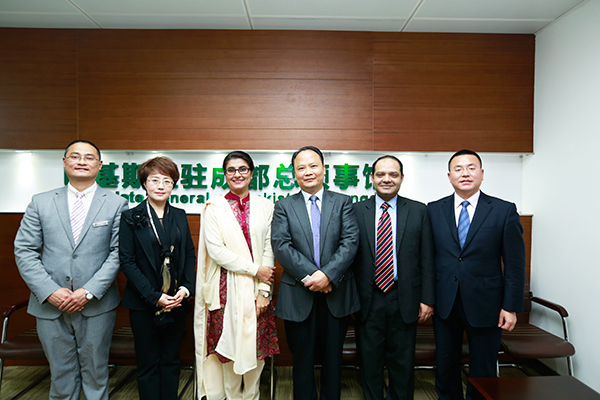 劉漢元主席、禚玉嬌總裁與巴基斯坦駐成都總領(lǐng)事阿姆娜•博魯什及商務(wù)領(lǐng)事博哈利合影