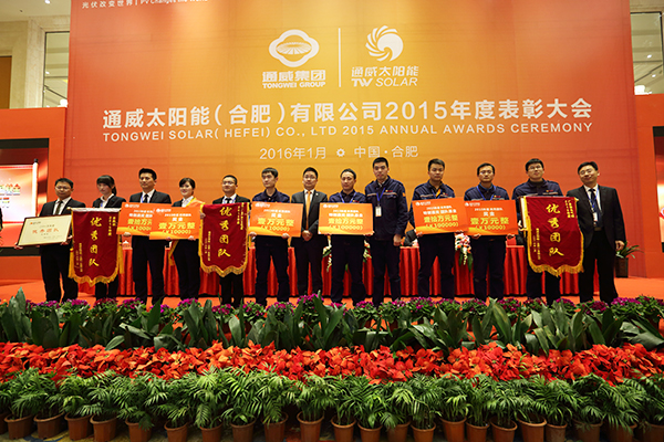 1月14日,通威太陽能(合肥)公司2015年度表彰大會隆重召開。十一屆全國政協常委、通威集團董事局劉漢元主席專門發來賀信,通威集團總裁助理、通威太陽能(合肥)有限公司、通威太陽能(成都)有限公司董事長謝毅及公司高管出席大會,通威太陽能(合肥)有限公司員工代表、通威太陽能(成都)有限公司全體員工共三百余人歡聚一堂,共慶碩果。通威集團企業文化項目組專家王驥、江靜應邀出席大會?! ?nbsp;
