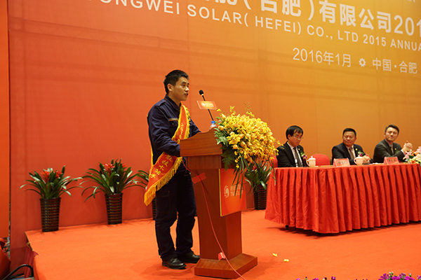 財務部經理安祥作為優秀管理干部代表發言,他表示,2015年是公司“跳起摸高”的一年,在謝毅董事長及高管團隊的帶領下,全體員工奮勇拼搏,公司取得了斐然的經營業績。在公司的各個管理層級,還有很多比他更優秀的同仁一直在默默耕耘、辛勤付出。集團敢于在市場沒有明顯回暖跡象時,以8.7億元的重金收購公司,不單是前期長時間科學客觀研判的結果,也是基于深耕新能源產業多年來,對行業發展的精準洞察。2014年上半年,公司在市場反映不如預期的情況下,并沒有簡單放棄、消極怠工,而是積極通過科學的測算和評估,對外積累客戶資源、發掘市場機會、尋找突破口,對內苦練內功、對標改善、夯實基礎。2014年下半年,公司敏銳捕捉到市場回暖的信號,利用前期的資源和管理基礎迅速通過市場倒逼的方式及時調整經營策略,高度匹配市場需求,從而帶動產能的持續高效發揮,實現了公司2015年出貨量國內第一、質量評價行業第一、成本行業內最低,造就了行業領導者地位。安祥認為,通威太陽能(合肥)公司的“成功密碼”就是“科學決策、穩扎穩打、市場驅動、持之以恒”!
