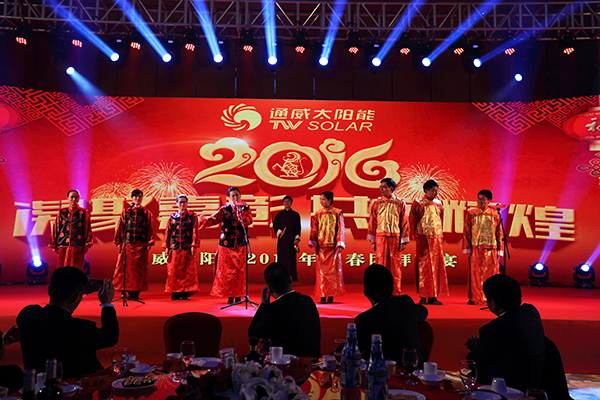羊舞豐收歲,猴吟錦繡春。1月14日,通威太陽能(合肥)公司2016年“凝聚嘉彰,共創(chuàng)輝煌”新春團(tuán)拜晚宴圓滿舉行。通威集團(tuán)總裁助理、通威太陽能(合肥)有限公司董事長、通威太陽能(成都)有限公司董事長謝毅,公司高管團(tuán)隊及家屬代表,通威太陽能公司全體員工共計三百余人歡聚一堂,共同分享大家庭的溫馨與精彩。通威集團(tuán)企業(yè)文化項目組專家王驥、江靜應(yīng)邀出席晚宴。