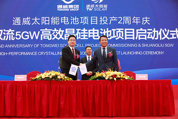 11月18日,在通威太陽能電池項目投產2周年慶暨雙流5GW高效晶硅電池項目啟動儀式上,通威集團與協鑫(集團)控股有限公司、西安隆基硅材料股份有限公司三方共同簽署合資協議,與阿特斯、天合光能、晶科分別簽署長單客戶協議,將各自憑借其優勢環節展開合作、優勢互補,形成更大的產業空間。