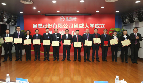 隨后,劉主席、嚴(yán)總一同為“通威大學(xué)”的成立揭牌剪彩,隨著鮮艷的紅綢緩緩揭起,現(xiàn)場(chǎng)雷鳴般的掌聲詮釋了通威人內(nèi)心的激動(dòng)與興奮,這一刻意味著通威人有了自己的成長(zhǎng)家園,行業(yè)增添了夢(mèng)想實(shí)現(xiàn)的天地;這一刻揭開了通威人用“培養(yǎng)精英、創(chuàng)造精品”的理念,邁向?qū)崿F(xiàn)“將軍的搖籃”的偉大愿景。會(huì)上,聘任了一批通威大學(xué)“首席專家”和“專家級(jí)講師”。